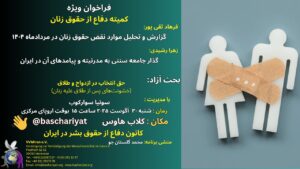 کانون دفاع از حقوق بشر در ایران برگزار میکند از شما فعالان حقوق بشر، آگاهان و همکاران گرامی دعوت میشود تا ما را در این جلسه ی سخنرانی همراهی فرمائید سخنرانی، پرسش و پاسخ، بحث و گفتگو