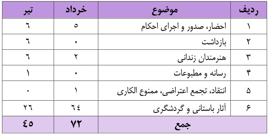 این گزارشات آماری از میان بیش از ۴۵ خبر در طول تیر ماه ۱۴۰۴ تهیه شده است.