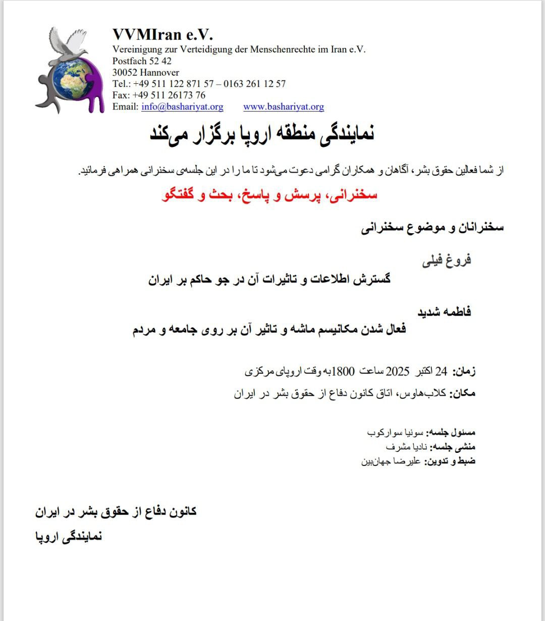 جلسه ویژه نمایندگی اروپا در تاریخ ۲۴ اکتبر ۲۰۲۵ و در ساعت ۱۸:۰۰ به وقت اروپای مرکزی از طریق فضای مجازی کلاب هاوس، با مدیریت سونیا سوارکوب و مهمانان جلسه: فروغ فیلی با موضوع: گسترش اطلاعات و تاثیرات آن در جو حاکم بر ایران، و فاطمه شدید با موضوع: فعال شدن مکانیسم ماشه و تاثیر آن بر روی جامعه و مردم، برگزار گردید. همکارانی که ما را در برگزاری این جلسه لایو یاری کردند عبارتند از: مسئول جلسه: سونیا سوارکوب، منشی جلسه: نادیا مشرف قهفرخی، ضبط صدا و تدوین: علیرضا جهان بین، ادمین: نازی جلالی. علاقمندان می توانند گزارش صوتی جلسه فوق را از طریق فایل های صوتی زیر شنوا باشند: