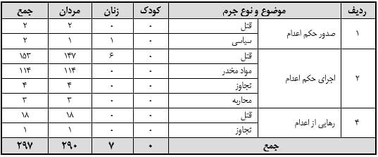 متأسفانه برغم تمام تلاشهایی که از جانب فعالین و نهادهای حقوق بشری صورت میگیرد، صدور و اجرای حکم اعدام که یکی از مهمترین موارد نقض حقوق بشر ایرانیان بشمار میرود، کماکان پا برجاست و هیچگونه آمار دقیقی نیز از تعداد آنان وجود ندارد، لاجرم ما در این گزارش مواردی که خبرگزاریهای مورد تأیید دولت ایران منتشر کردهاند را به ۳ گروه «اخبار، صدور و اجرای حکم اعدام» تقسیمبندی نمودهایم که نمیتواند در برگیرنده تمام اعدامهای گستردهای باشد که هر روزه و بصورت پیدا و پنهان در جمهوری اسلامی ایران اجرا میشود، گفتنی است بیش از ۷۵ درصد اعدامها بصورت مخفیانه اجرا شده و توسط دولت یا نهاد قضایی اطلاع رسانی نمیشوند و یا اعدام با اتهاماتی واهی و یا بدون وجود مدرک و یا دلایل کافی که با استناد به حکم «قَسامه» در فقه اسلامی و حقوق کیفری ایران وجود دارد، یعنی نقض ماده ۱۰ اعلامیه جهانی حقوق بشر.