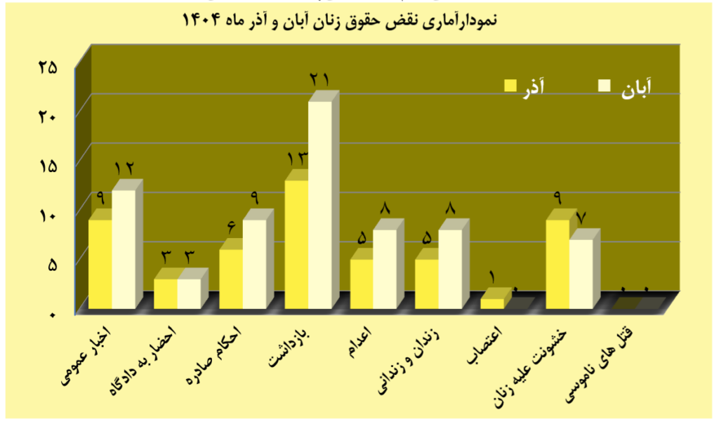 اخبار و گزارشهای مربوط به نقض حقوق زنان در آذرماه ۱۴۰۴ که توسط اعضای کمیته دفاع از حقوق زنان گردآوری شده است .جهت اطلاعات بیشتر در لینک زیر قابل مشاهده است: