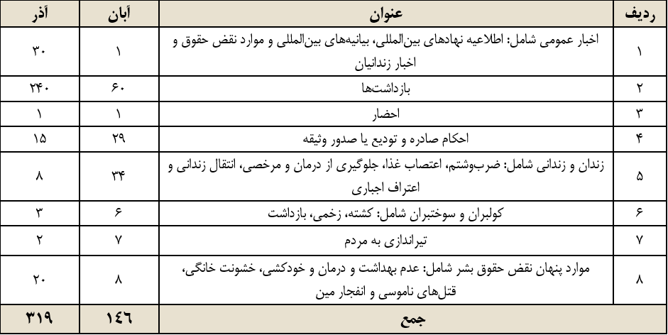 یادآوری: با توجه به سانسور خبری حاکم بر رسانههای ایران، این گزارش تنها بیانگر گوشههایی از نقض حقوق اقوام مختلف ایرانی است که توسط خبرگزاریهای مورد تأیید ایران، بازتاب داده شده است و نمیتواند بیانگر نقض گستردۀ این قشر بزرگ از هممیهنانمان باشد.