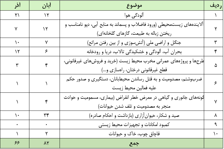 این گزارشات آماری از میان بیش ۶۶ خبر که در طول آذر ماه تهیه شده است. این گزارشات ازسایت کمیته دفاع ازمحیط زیست تهیه شده است که از رسانههای داخلی و خارجی مانند هرانا، ایلنا، ایرنا، دیدهبان، ایسنا، مهر، خبربان، قطره، تسنیم، یورونیوز، انصاف و پایگاه خبری محیط زیست و حیات وحش و … جمعآوری گردیده است.