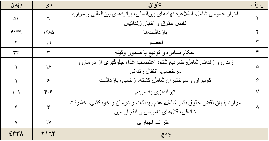 یادآوری: با توجه به سانسور خبری حاکم بر رسانههای ایران، این گزارش تنها بیانگر گوشههایی از نقض حقوق اقوام مختلف ایرانی است که توسط خبرگزاریهای مورد تأیید ایران، بازتاب داده شده است و نمیتواند بیانگر نقض گستردۀ این قشر بزرگ از هممیهنانمان باشد.